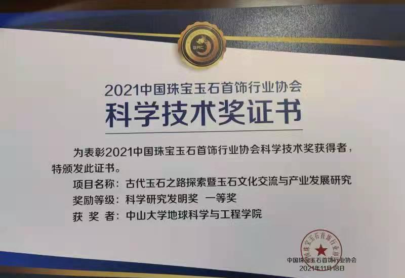 ok138cn太阳集团丘志力教授研究团队历时15年(2005-2020),在多个国家自然科学基金、省科学基金及产业发展项目(国家基金:40873021;41173041;41673032)的资助下,综合科研成果“古代玉石之路探索暨与文化交流玉产业发展研究”获中国珠宝玉石首饰行业协会2021年44118太阳成城集团发明奖一等奖。