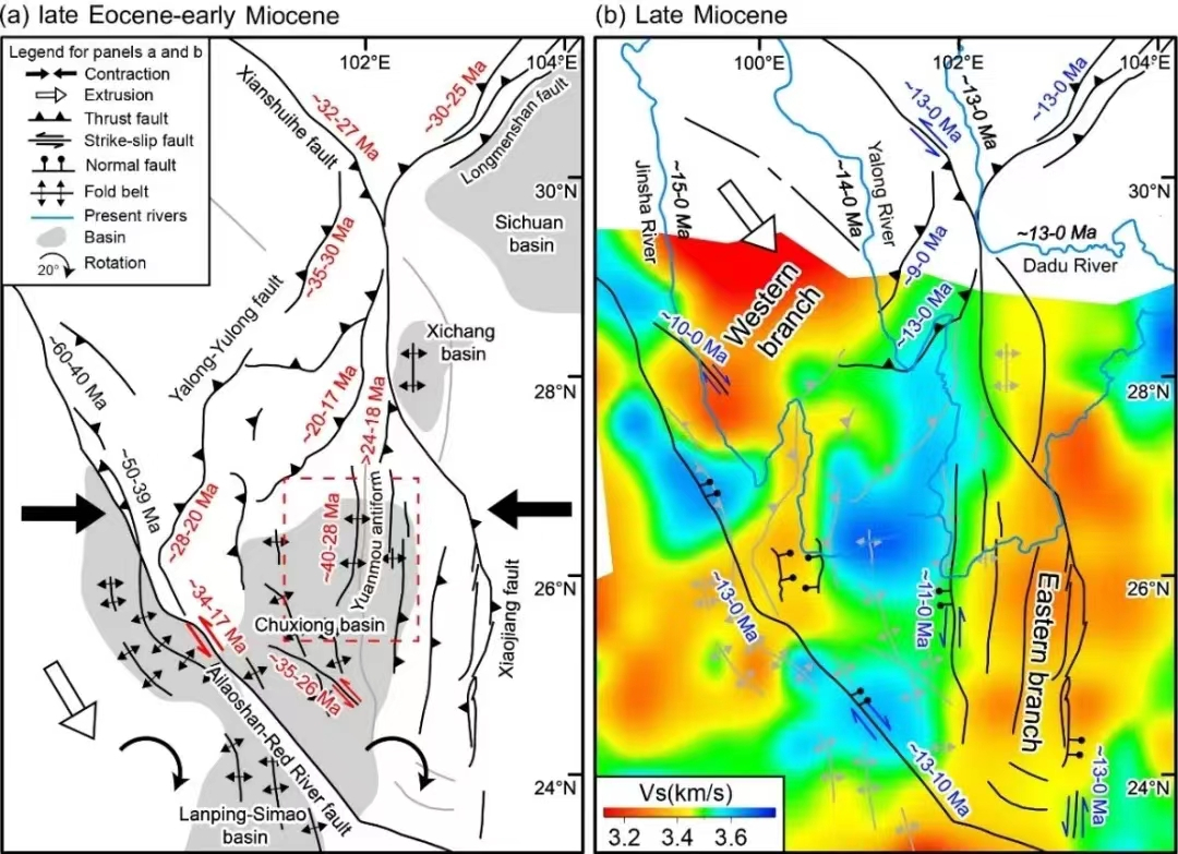 青藏高原是研究陆陆碰撞及资源环境效应的天然实验室。新生代以来,印度与欧亚板块的碰撞驱动了青藏高原向东南方向的扩展和挤出,活化了青藏高原东南缘的先存构造带(哀牢山-红河断裂带等)。青藏高原东南缘的构造变形和地表隆升,不仅影响亚洲季风气候的演变,而且可能与南海的形成与演化存在一定的成因联系。因此,青藏高原东南缘构造变形、地壳加厚与地表隆升的过程与动力机制,一直是国际学术研究的前沿和热点。相关的学术观点主要包括以下两种:晚始新世以来侧向挤出与地壳缩短;晚中新世以来中-下地壳管道流。然而,前者难以解释东南缘区域地壳加厚(50-65 km)与微弱地壳缩短(<20%)之间的矛盾;后者难以解释中-下地壳低速体不连续的空间分布(图1b),且中-下地壳大规模(上千公里)流动所需要的地壳粘度(1016-1018) Pa•s比诸多观测结果低约2个数量级。