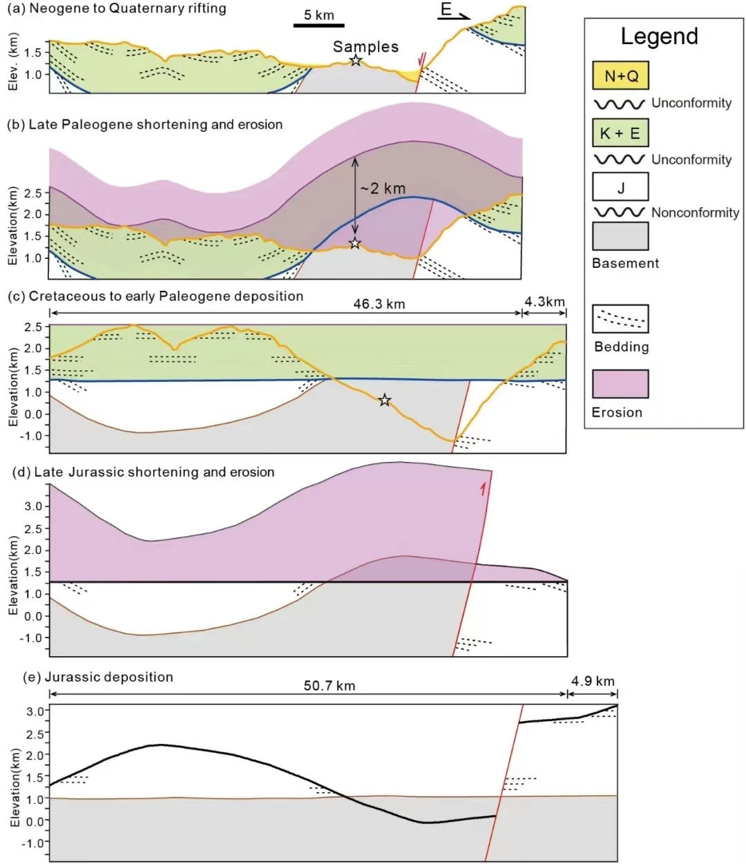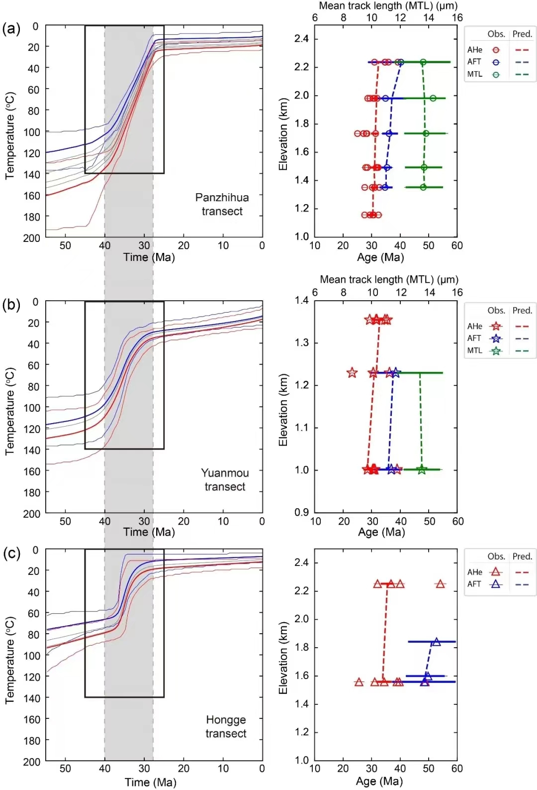 ok138cn太阳集团田云涛教授课题组长期关注青藏高原东南缘构造变形过程与动力机制,近年来指导博士生张贵洪同学,对比了该地区主要断裂带(哀牢山-红河、鲜水河与玉龙-雅砻断裂带)与川滇块体内部的构造变形历史与变形量(图1),发现(1)位于川滇块体内部的元谋背斜,在早-中新生代经历了一期近E-W向地壳缩短变形,其缩短率仅为约9%(图2),元谋背斜轴部的三个年龄-高程剖面的磷灰石(U-Th)/He与裂变径迹及热历史反演模拟,揭示该期变形发生在约40-28 Ma期间(图3);(2)始新世-早中新世期间,大型断裂带(红河-哀牢山、鲜水河断裂带等)经历了大规模地壳加厚、高温变质和剥蚀作用(>15-10 km),远远高于构造带之间的区域(元谋地区等),说明该时期构造缩短量具有明显的空间不均一性(图1a);(3)晚中新世的构造变形和剥蚀作用在区域上更加普遍,在断裂带及之间的地区均有发育,且量级近似(图1b)。