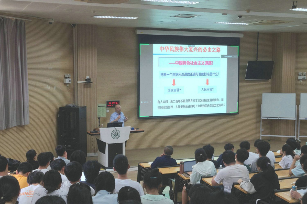 王雪华副校长首先阐释了中国特色社会主义民主的特征与优势。随后,讲述了中国人民抵抗侵略、追求国家独立和民族复兴的中国近代史。鸦片战争等抵御外来侵略者战争的结局最终以失败而告终,中华民族遭受了前所未有的苦难,被迫签署一系列不平等条约,中国沦为半殖民地半封建社会。1919年五四运动推动社会主义思潮在中国的蓬勃兴起,是中国新民主主义革命的伟大开端。1921年,中国共产党成立,从此新民主主义革命拥有了坚强的领导核心。在中国共产党的领导下,中国人民推翻了三座大山在旧中国的统治,完成了新民主主义革命,建立了中华人民共和国,新中国的成立开启了中国特色社会主义道路的伟大探索。这说明了中国特色社会主义道路是党和人民在长期实践中开辟出来的正确道路,中国特色社会主义道路是历史的必然选择。