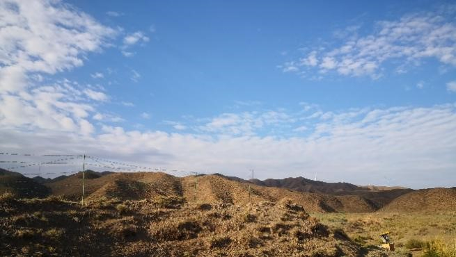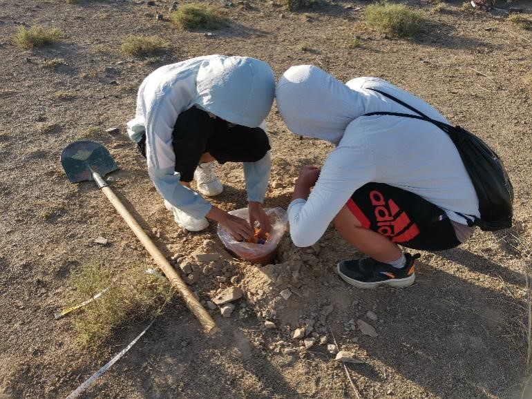 在大致了解海原断裂带的构造背景后,大家开始着手布设地震仪,每条测线间隔10m并布设12台地震仪。在老师们的指导下,同学们完成了确定测线、记录点位、挖坑放置仪器和仪器开机等主要步骤。截至7月7日,大家完成了一共6条测线的布设。
