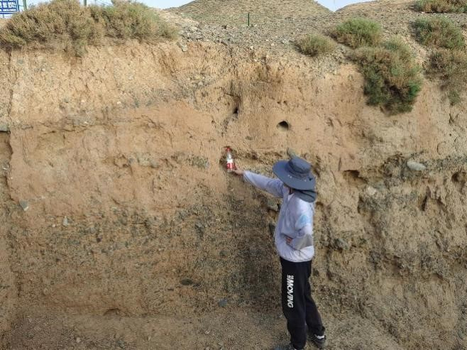 海原断裂是青藏高原东北缘发育的四条弧形活动断裂带中规模最大、活动最为强烈的一条左旋走滑型断裂带。历史上,从该断裂可以显著地观察到地震导致的地层错断和地形地貌变化。到达实习区域后,在老师们的指导下,同学们根据探槽中的地层错动,对海原断裂的性质有了基本的认知。探槽上清楚地展示了地震挤压应力影响下的破裂带增厚、错动的过程。