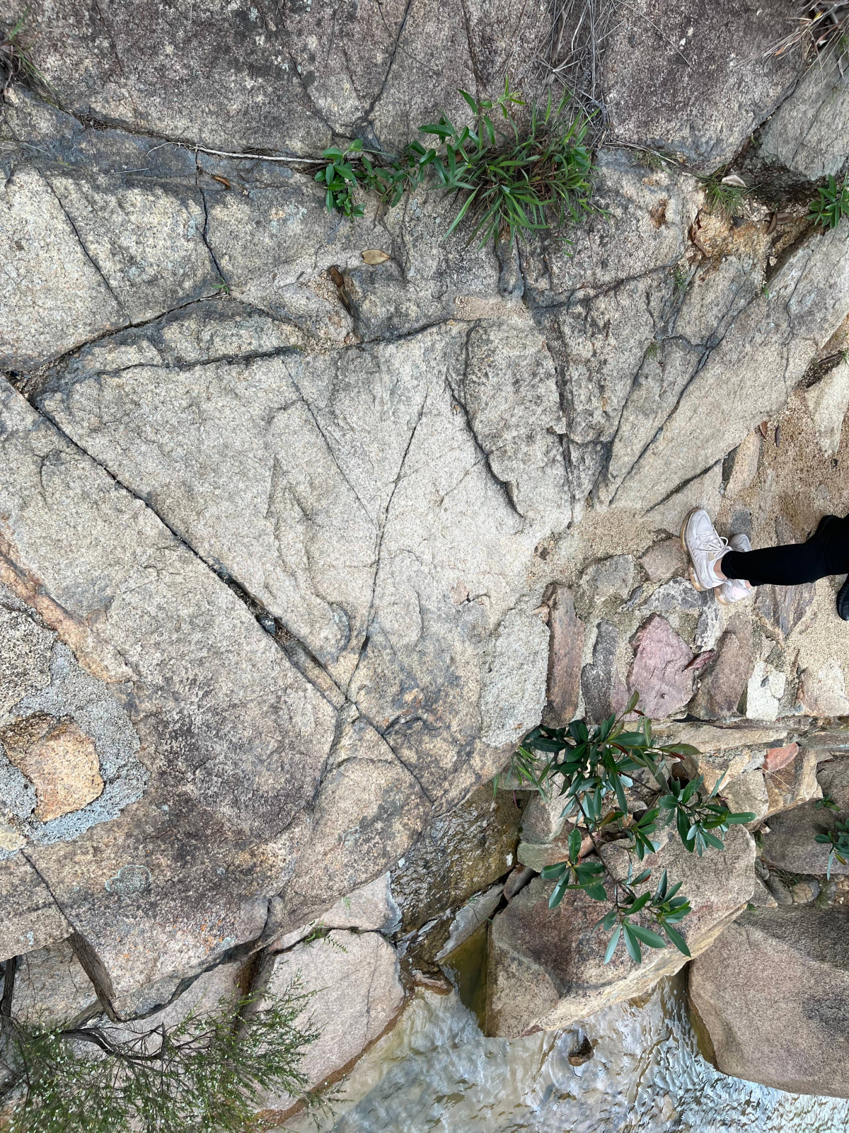 在实践学习环节,支部同志们在攀登途中利用课堂所学理论知识对各类岩石与地质现象进行考察与交流学习。由于红花山森林公园地质现象明显,裸露的岩土正是对理论成果的最好验证。例如,从岩石出露位置(图1)上观察,可见岩石发生了一定程度的蚀变,其中细长呈脉状的结构是脉石英(脉石英是由地下岩浆分泌出来的SiO2的热水溶液填充沉淀在岩石裂缝中形成的,后经地质构造运动出露在地表),同时在地表发现了一些共轭节理(图2,节理是指在地质作用下,岩石发生一系列规则的破裂,但破裂面两侧岩石没有发生明显的位移),反映了该地区经历过一些小的构造活动。