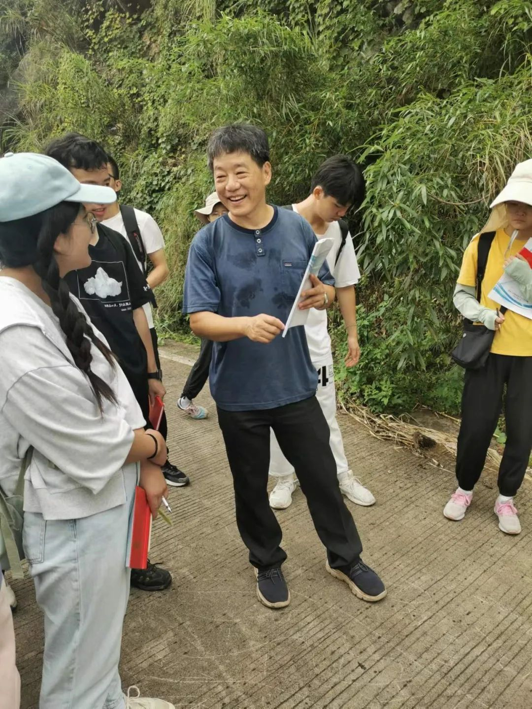烈日下认真讲解的老师和认真学习的同学们