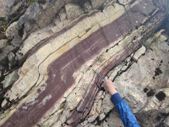 从神农谷出发,五分钟就到达了瞭望塔。在这里,我们近距离观察了乱石沟组的硅质岩与紫红色的泥质粉砂岩,注意到发育的软沉积变形构造。