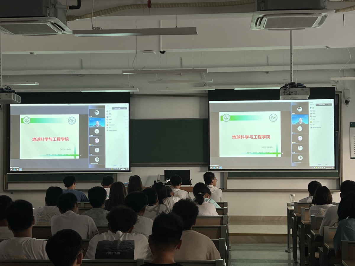 2022年10月9日下午,在南校园逸夫楼102课室,地科院院长书记思政第一课线上线下同步进行。王岳军院长、何晓钟书记为2022级本科新生讲授思政课,引导他们为自己的大学学习生活开好头起好步,青年教师专职辅导员洪涛副教授主持当天的课程。