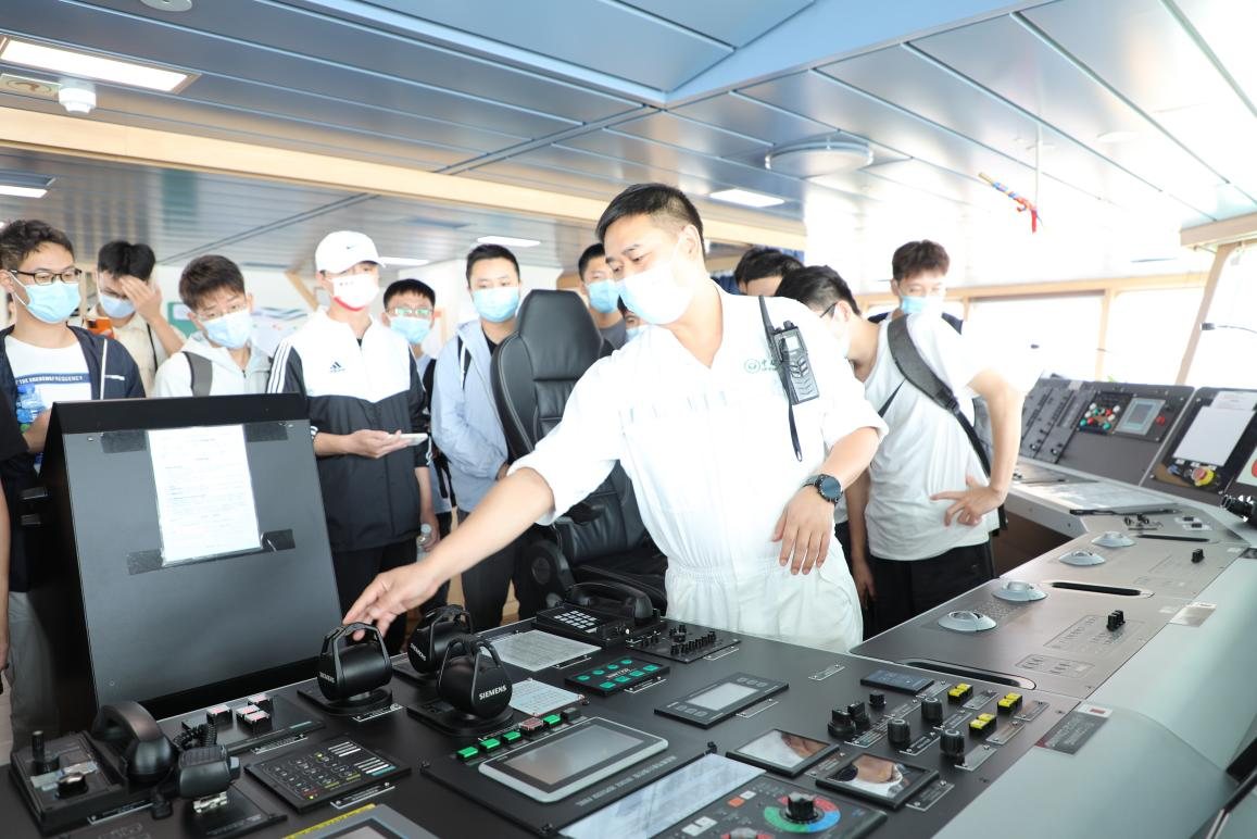 报告结束后,由金船长和大副带领同学们先后参观了科考船实验区域、作业区域、休闲生活区域、驾驶区域等,深入了解体验科考人员及船员的海上工作模式。期间,探测部赵旭老师向学生们介绍了船上配备的先进科考仪器、科考操作支撑和探测设备、样品处理、检测分析和数据处理的各类实验室,了解了船舶平台的综合性能和科考功能。赵旭老师还针对海上作业的主要设备,海水采集及温度—盐度—深度(CTD)系统、箱试取样器、长柱状活塞取样器、多波束海底地形测量系统、海底动态重力系统等,进行了较为详细的介绍,让同学们深入地进行了实地学习。
