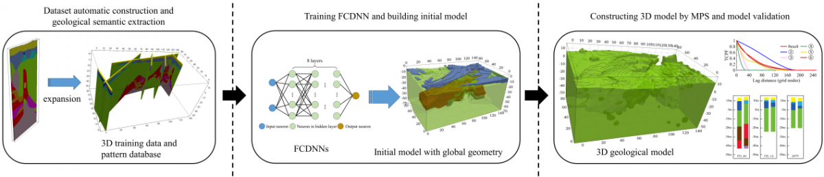我院侯卫生副教授团队针对地铁工程中的地质数据局部密度高、数据样本少特点,提出了一种融合全连接深度神经网络(FCDNN)与多点统计学(MPS)的三维地质结构重建方法,其基本思路见图1。该研究提出了以地质对象高程为核心参量的FCDNN核函数及其相应人工神经网络架构,建立了地层层序约束下的FCDNN与MPS相融合的地质结构三维重建损失函数。该方法以二维地质剖面作为建模数据源,以FCDNN网络构建初始三维模型,采用多尺度迭代MPS方法实现三维地质结构的优化。