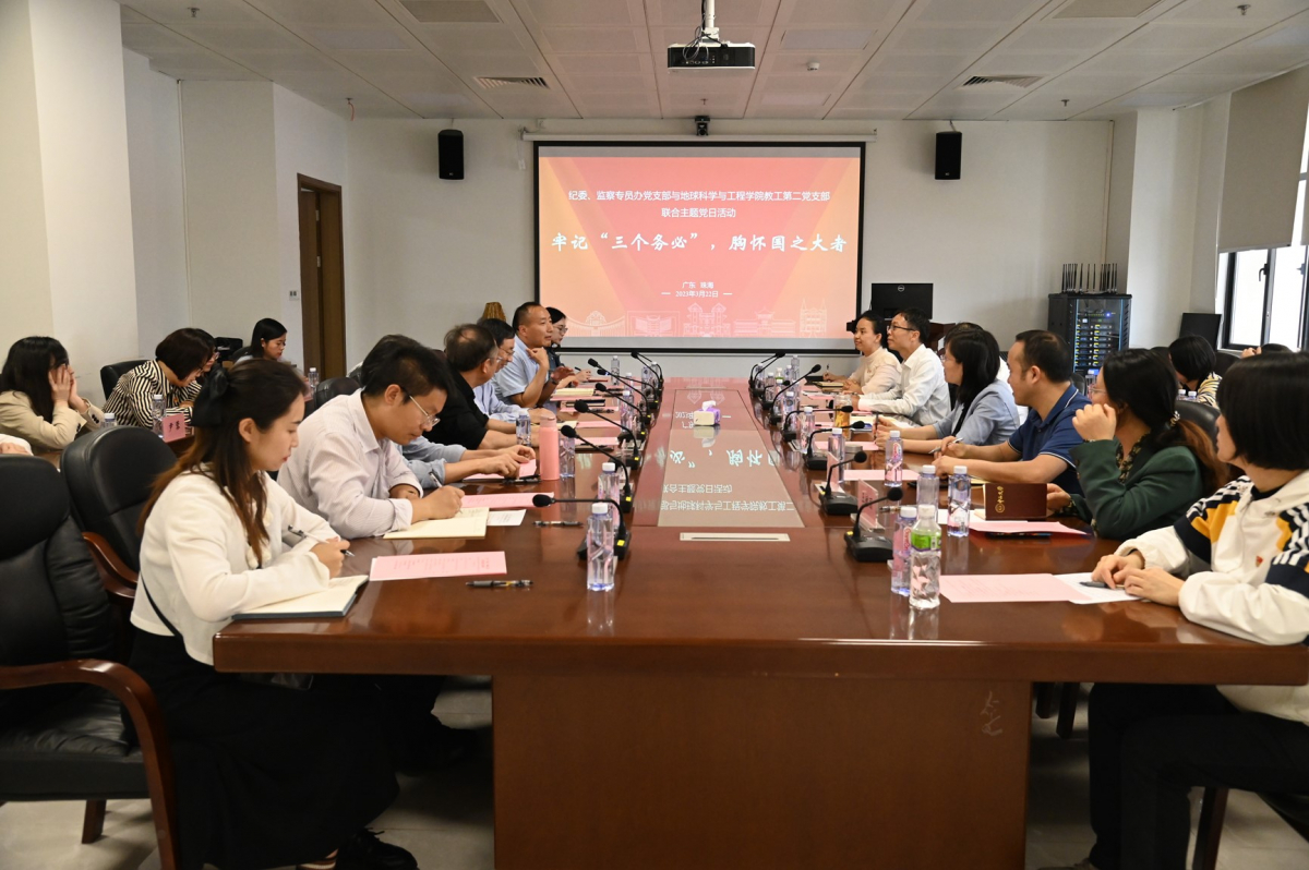 为深入学习贯彻党的二十大精神,深刻领会教育、科技、人才是全面建设社会主义现代化国家的基础性、战略性支撑的重大意义,并进一步加强新形势下党组织建设,深化党组织之间交流合作,拓宽支部党建工作思路,2023年3月22日,我院教工第二党支部与学校纪委、监察专员办党支部在珠海校区海琴4号C306联合开展了“牢记‘三个务必’,胸怀国之大者”主题党日活动。活动由我院党委书记何晓钟主持,校党委副书记、纪委书记、国家监委驻太阳集团tyc9728监察专员刁振强,校纪委副书记吴长征,我院张培震院士、王岳军院长,双方党支部党员参加了当天的活动。
