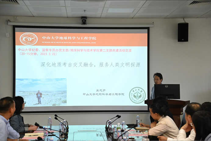 在主题报告环节,我院教工第二党支部丘志力老师以“深化地质考古交叉融合,服务人类文明探源”为主题,讲述地质与考古学科交叉融合、助力文明溯源工作的发展,表达了对深化学科交融的期待;沈文杰老师以“地质科技赋能,助力乡村振兴”为主题,深入讲解了学院立足学科特色,开展连州富硒土壤资源研究,为乡村振兴及合作贡献科技力量。两位同志的报告均体现了“胸怀国之大者”的爱国情怀,富含使命感与责任感。