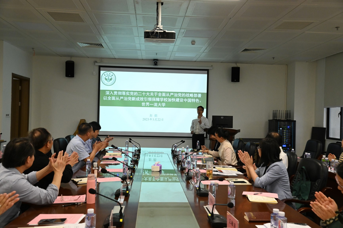 纪委、监察专员办党支部的彭懿同志围绕“深入贯彻落实党的二十大关于全面从严治党的战略部署,以全面从严治党新成效引领保障学校加快建设中国特色、世界一流大学”的主题进行发言。他从全面从严治党方面出发,深入阐述党的二十大精神,强调高校知识分子应该加强党风廉政建设,自觉接受监督。