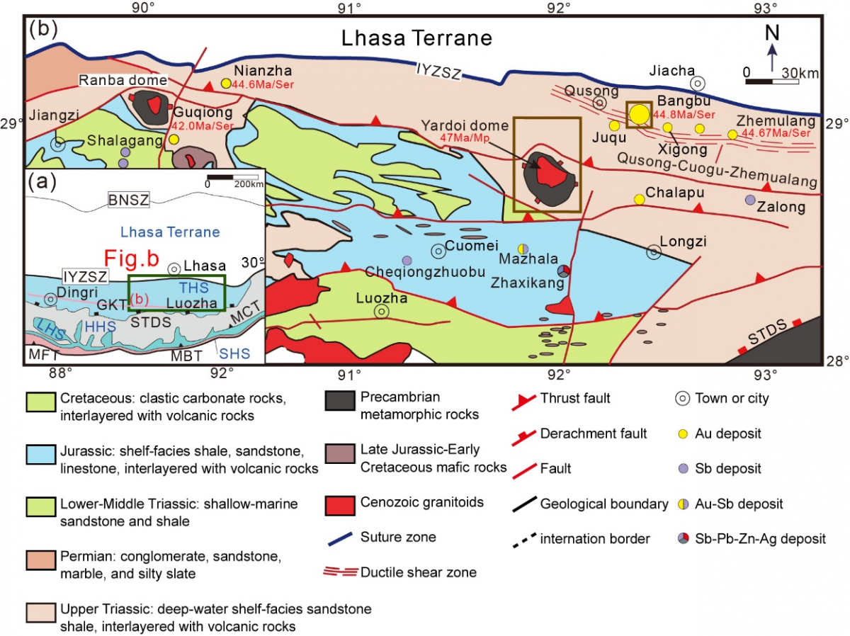 作为中国最重要的造山型金矿区之一,位于西藏南部的雅鲁藏布江缝合带(IYZSZ)在解决这个科学问题中起着关键作用(图1)。IYZSZ地区已探明金储量约为200吨,内部的造山型金矿床通常赋存于三叠纪变质沉积岩(朗杰学群)中,该地区的西侧出露一套以雅拉香波穹窿为中心的低绿片岩相-角闪岩相的完整变质带,其变质事件年龄和金成矿年龄一致。值得一提的是IYZSZ中除穹窿外仅出露少量辉绿岩脉,在前人的研究中两者均不存在金含量异常,因此可以排除它们在造山型金矿床的成矿过程中可能存在的潜在贡献,这为解决上述科学问题提供了重要的研究前提。