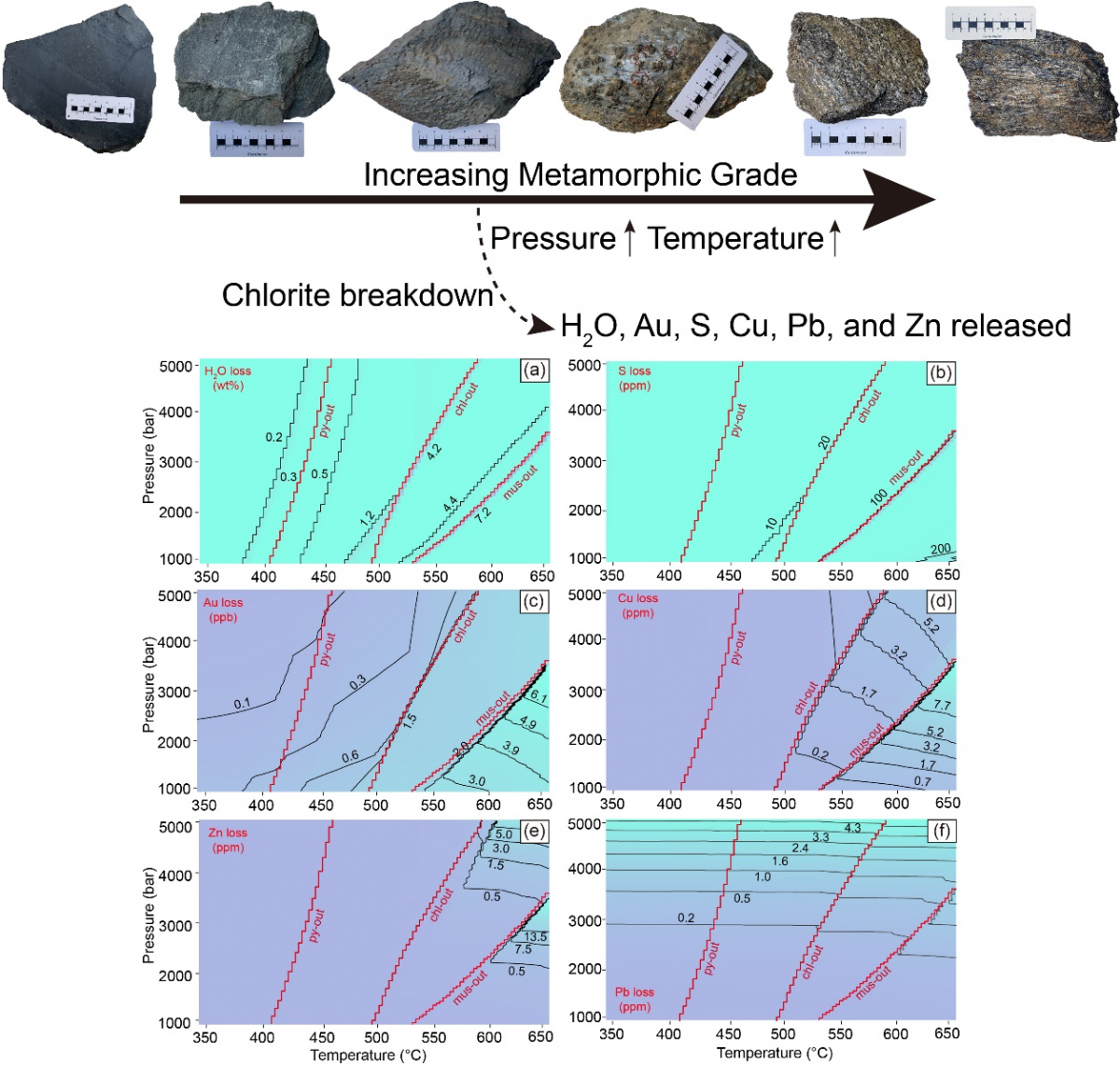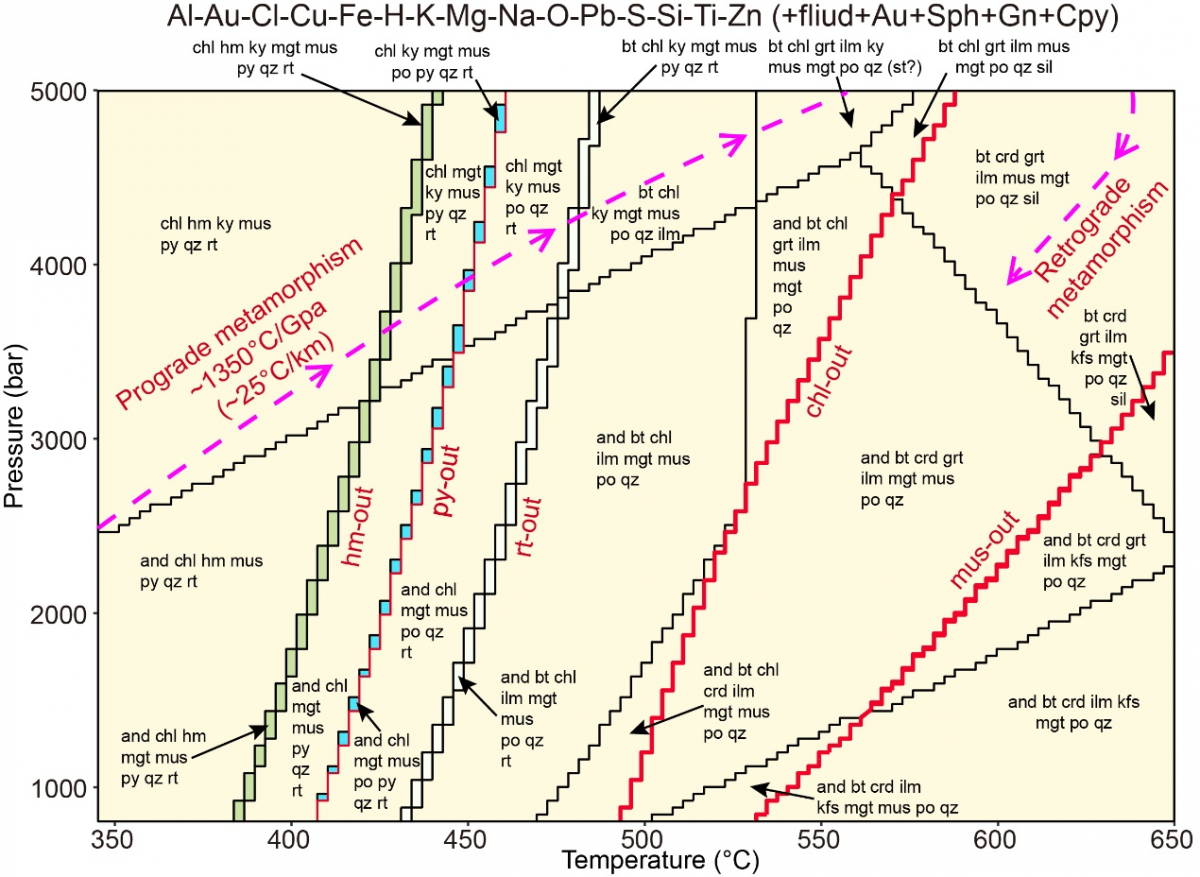 研究结果显示: IYZSZ的变质砂岩在经历低地温梯度(~25°C/km)的进变质作用时,绿泥石、白云母、石英、金红石、黄铁矿、磁铁矿、磁黄铁矿、蓝晶石和夕线石是不同等级变质岩中的主要矿物。随着温度压力增加,部分矿物发生转变形成新的矿物(图2)。这些变化对应了我们在镜下观察到在黑色板岩、千枚岩和云母片岩样品中的实际变质矿物组合。在变质岩P-T视剖图的基础上,我们提取了不同变质矿物转变过程中金属、硫和水的释放量(图3)。黄铁矿转变为磁黄铁矿、绿泥石和白云母的分解均能在变质过程中释放金属进入成矿流体中。然而,在低地温梯度下,变质沉积岩经历角闪岩相-麻粒岩相变质过程(下地壳深度)中绿泥石的分解是唯一能够释放大量金及其他元素的反应。我们进一步通过定量计算得知,下地壳变质沉积岩能够在该梯度下能够向矿石流体中释放至少1.5 ppb Au、5.2 ppm Cu、4.3 ppm Pb、5.0 ppm Zn和20 ppm S。通过进一步的质量平衡计算,我们发现1km3变质沉积岩中可迁移出4.05 t Au、14040 t Cu、11600 t Pb和13500 t Zn。尽管这个级别的金属释放量无法形成大型Cu、Pb和Zn矿床,但足以形成大型的造山型金矿床。因此,IYZSZ的下地壳变质沉积岩能够视作金的主要源区。综上所述,我们认为下地壳变质沉积岩能够提供足够的金及其他元素以形成IYZSZ金矿带以及世界范围内其他变质沉积岩容矿的造山型金矿床。