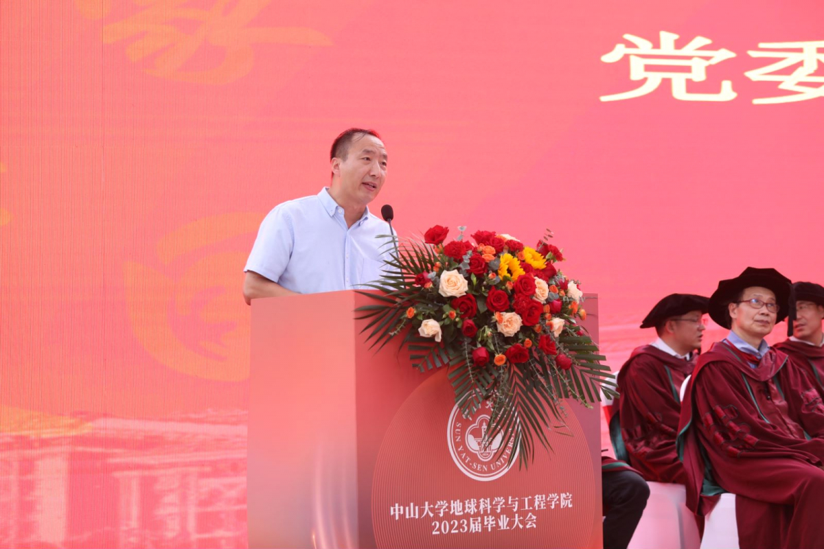 学院张培震院士、高锐院士、成秋明院士,丘志力老师、曹建劲老师、汤连生老师、廖杰老师、高燕老师、侯卫生老师、钱鑫老师、张冬丽老师等导师代表分别向2023届毕业生寄语。各位老师祝贺同学们在自己的努力、导师的指导和同学亲友的关心帮助下顺利完成学业的同时,希望全体毕业生们,怀抱理想,不惧磨难,脚踏实地;希望同学们能成为有理想、有知识、有能力的具有家国情怀的优秀人才;希望同学们扎根中国大地,把个人的理想与国家的发展结合起来,奉献国家、成就自我;保持热心、培养耐心,建立信心,坚守初心,在今后的工作和学习生活中带着中大地科人的坚忍不拔、奋斗不息的精神,书写自己的诗与远方。