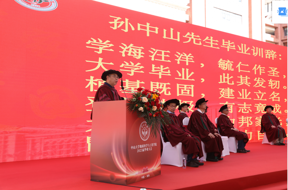 凤凰花再开,学子又启航。2023年6月,我院110余名学生圆满完成学业、顺利毕业,分别获得学士、硕士、博士学位,开启下一段继续深造或就业入职新旅程。6月27日下午,ok138cn太阳集团2023届毕业典礼暨2023年学位授予仪式在珠海校区海琴四号楼隆重举行。中国科学院院士张培震教授、高锐教授、成秋明教授,王岳军院长、何晓钟书记、郑文俊副院长、王伟涛副院长、张照副书记、廖杰院长助理,当天在珠海校区的全体教职工出席,全体2023届毕业生参加了毕业典礼。何晓钟书记主持了当天的毕业典礼。