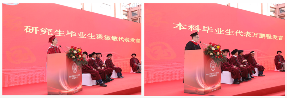 万鹏程同学和梁淑敏同学分别代表本科毕业生和研究生毕业生作了发言。他们感谢在校期间母院给予的各种支持与帮助,感谢各位老师辛勤的付出,他们祝愿同学们鹏程万里、老师们桃李天下,学院未来越来越好。