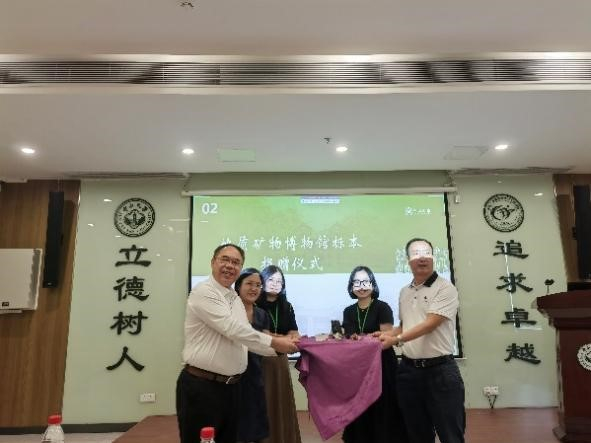 在活动现场,2009级研究生凌娴、2010级研究生周永哲代表团队全体毕业生,向学院地质矿物博物馆的宝玉石馆捐赠标本(内含学生余晨从德国专门赠送学院的4件新标本),王岳军院长、何晓钟书记、张照副书记代表学院接受标本并合影留念。