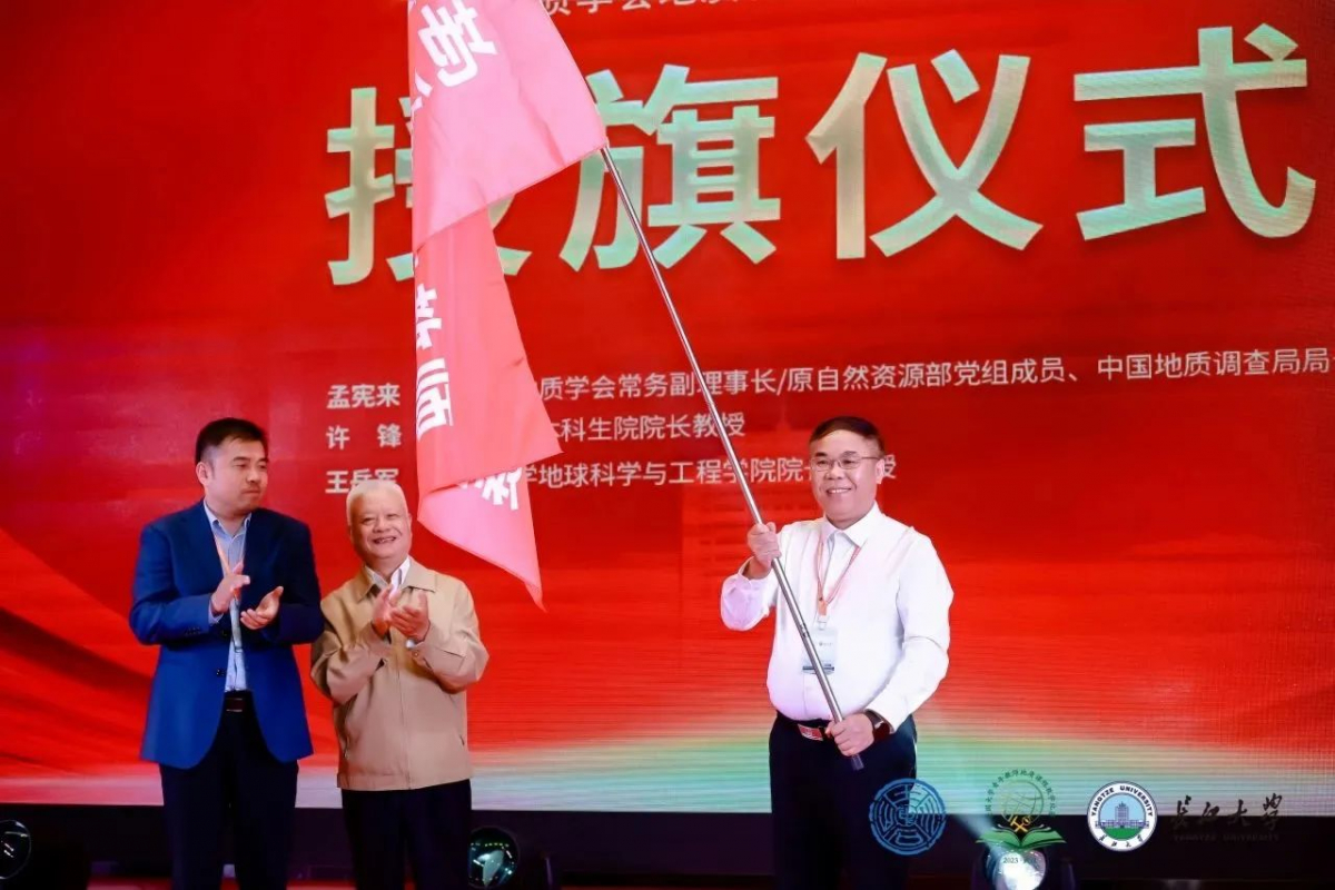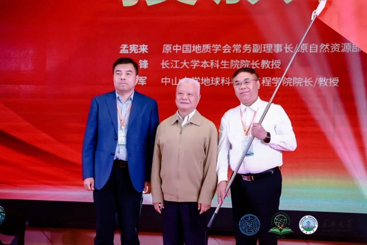 图:我院王岳军院长接过“全国大学青年教师地质课程教学比赛”旗帜