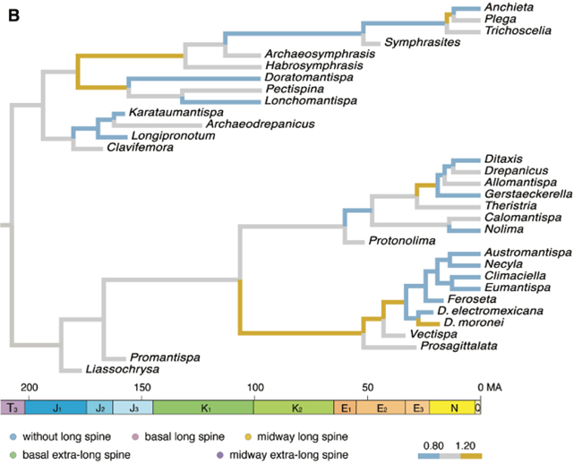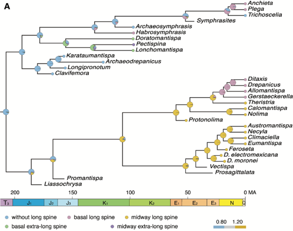 根据系统发育和几何形态分析结果,螳蛉科起源于约两亿年前,分别在侏罗纪–早白垩世、古近纪两个时期经历显著的快速辐射演化,形成六个亚科,亚科间捕捉足股节形态高度多样化,差异显著。三维形态空间显示捕捉足股节形态分异表现出三个阶段:第一阶段为中侏罗世–早白垩世,以绝灭的Mesomantispinae为代表的短刺型可能为股节形态的原始状态,通过祖先状态重建,也证实了这一结论;第二阶段为晚白垩世,形态空间开始发生分异,出现长刺型的Doratomantispinae;第三阶段为新生代,形态空间发生多方向性的分异,现生亚科全部出现。