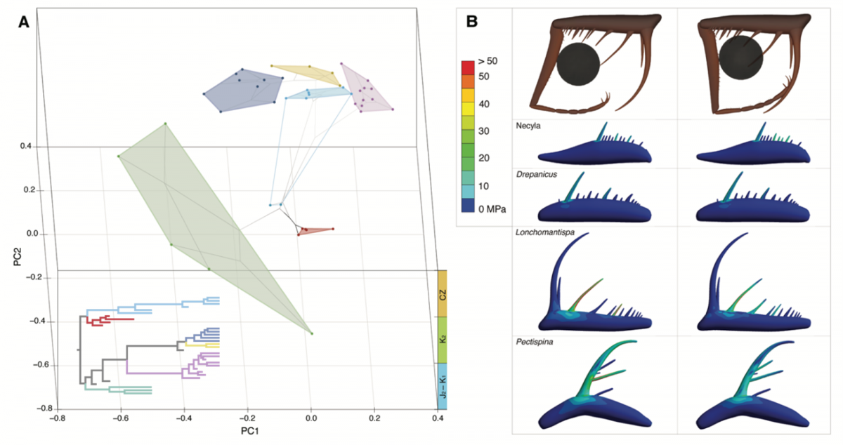 本文对化石与现生螳蛉捕捉足进行了三维重建,分别对数值模型和3D打印模型进行了有限元分析和力学实验,模拟了捕捉足夹持和穿刺猎物的场景。结果表明:夹持猎物时,超长刺型捕捉足受到的应力远高于其它类型,长刺易损伤;穿刺猎物时,超长刺型捕捉足的应力显著降低,而短刺及中长刺型捕捉足在两种场景中无显著差异;因而推测超长刺型捕捉足采用穿刺行为较夹持猎物更具优势。综合捕捉足在捕食过程中自身受力情况、施加于猎物的应力、穿刺猎物所需的力以及捕食距离等多项功能性状量化分析显示:螳蛉科演化的第一阶段捕捉足以基础功能为主,捕捉距离较大,无穿刺能力,能够施加给猎物较强的力,自身承受应力较小;第二阶段功能开始特化,增强对猎物的力或开始具有穿刺能力,但是夹持时自身应力也显著增大;第三阶段功能更为多样化,多个性状指标的最强值出现在第三阶段,同时负效应较第二阶段减小,整体趋于更稳定的状态。