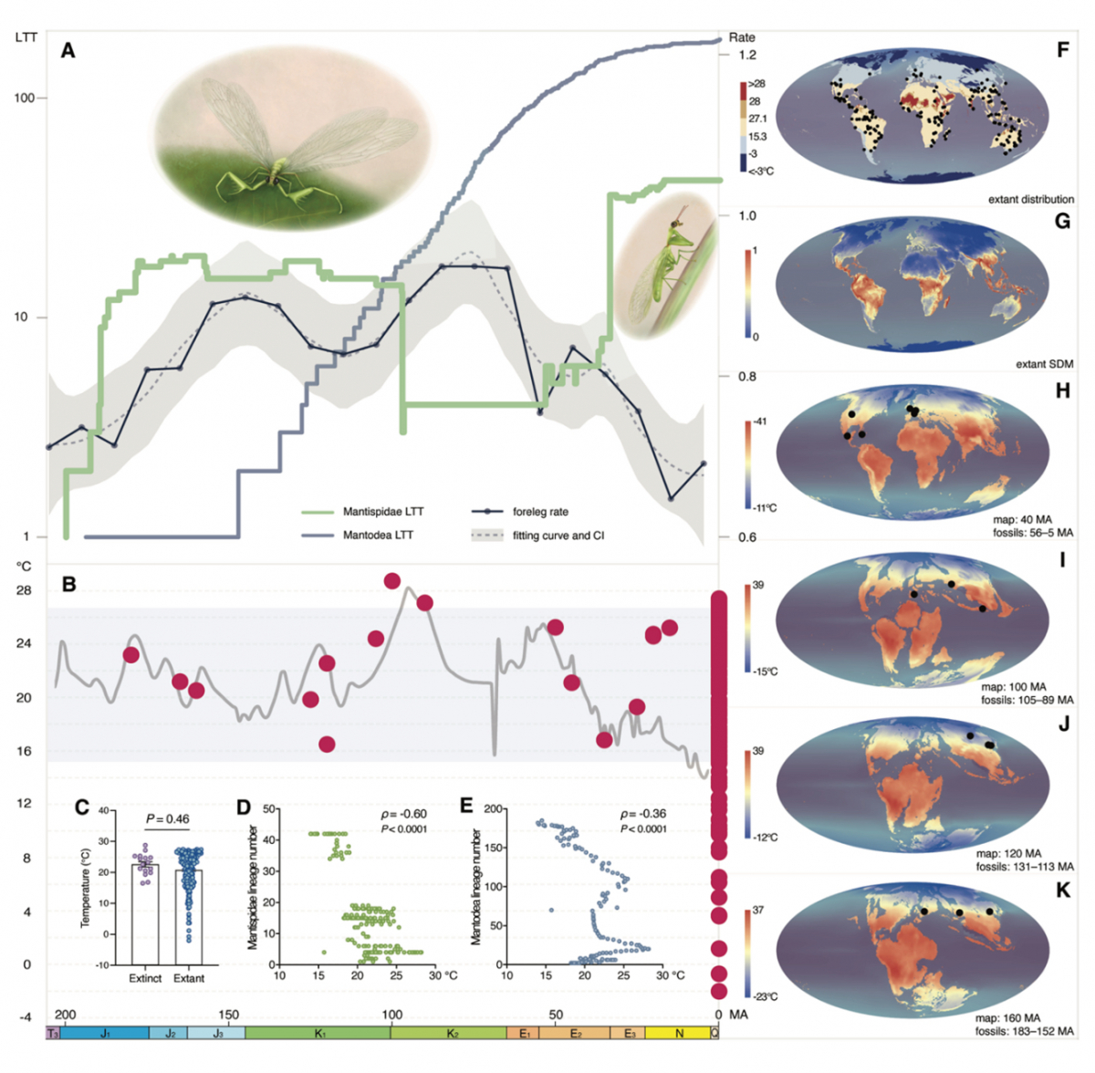 螳蛉科支系数变化与净多样化率表明,螳蛉科经历了两个辐射期。第一次辐射演化发生在侏罗纪–早白垩世,推测为三叠纪末大灭绝事件导致空出大量新的生态位,随着陆地生态系统的恢复,捕捉足的类型与属种多样性同步上升。但在第二个辐射期,螳蛉科支系多样化滞后于前足演化速率。捕捉足在晚白垩世开始的快速演化推测为被子植物的崛起,引发植物以及植食昆虫引起的生态空间革新刺激了捕食器官的多样化,为螳蛉的第二次物种辐射奠定了基础。这一阶段捕捉足与支系演化的不同步,可能是由于这一时期地球生态环境发生了变化。螳螂目的支系数变化曲线显示其自白垩纪以来快速辐射,由此带来的生态竞争压力可能是导致螳蛉在第二阶段物种多样化晚于前足演化的原因之一。此外,晚白垩世全球气温波动大,曾达到了近两亿年以来的最高温,但基于化石与现生螳蛉的生态位模型分析发现,螳蛉在演化历史中对温度的适应性未发生过显著变化,长期处于较温暖的区域,而未到达过极热的地区,且螳蛉的支系数与温度呈现更强的负相关。因此,93 Ma的C-T极热事件及紧随其后的温度骤变可能是导致螳蛉在这一时期多样性低的另一原因。当全球气温降至螳蛉的适生温度后,其多样性再一次升高;同时,得益于捕捉足在此前的多样化,螳蛉在第二次辐射期占据了适应于新生代捕食方式的生态位,在古近纪完成了第二次辐射。