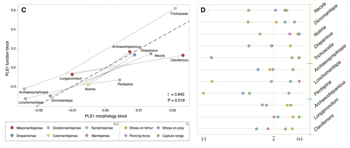 系统发育回归分析显示,螳蛉捕捉足的形态分异与功能性状表现为显著的强相关,结合捕捉足演化速率与祖先状态重建的结果表明,捕捉足功能的特化由形态的变异所驱动,其演化对支系的分化具有重要影响,股节刺的演变在其中发挥了重要作用。
