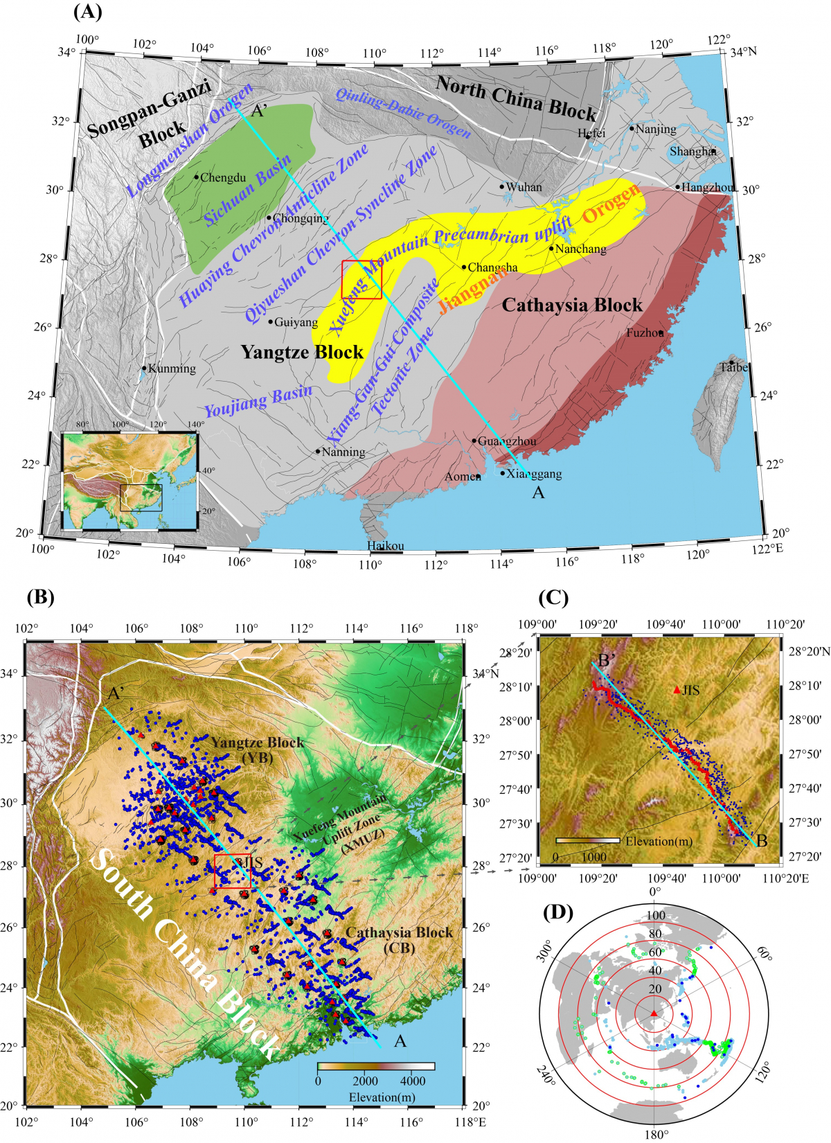 本研究将利用中国地震台网固定地震台站的长周期地震资料研究华南地块壳幔的大尺度结构,利用麻阳地区短周期密集地震台阵数据研究雪峰隆起带西北缘的小尺度地壳精细结构。研究所使用的中国地震台网固定地震台站的位置与短周期密集地震台阵的位置如图1B与图1C所示。