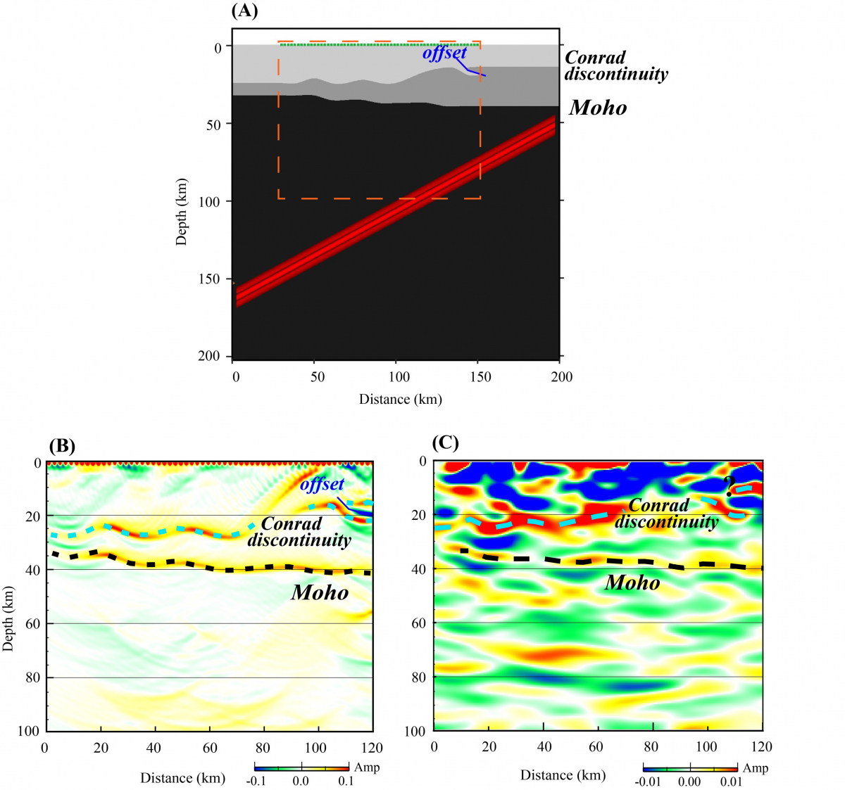 针对短周期密集地震台阵结果中的主要结构特征,例如Moho与Conrad的起伏,本研究利用SPECFEM2D进行了2D模拟重建,验证了对PRF成像剖面2D结构的认识(图5)。