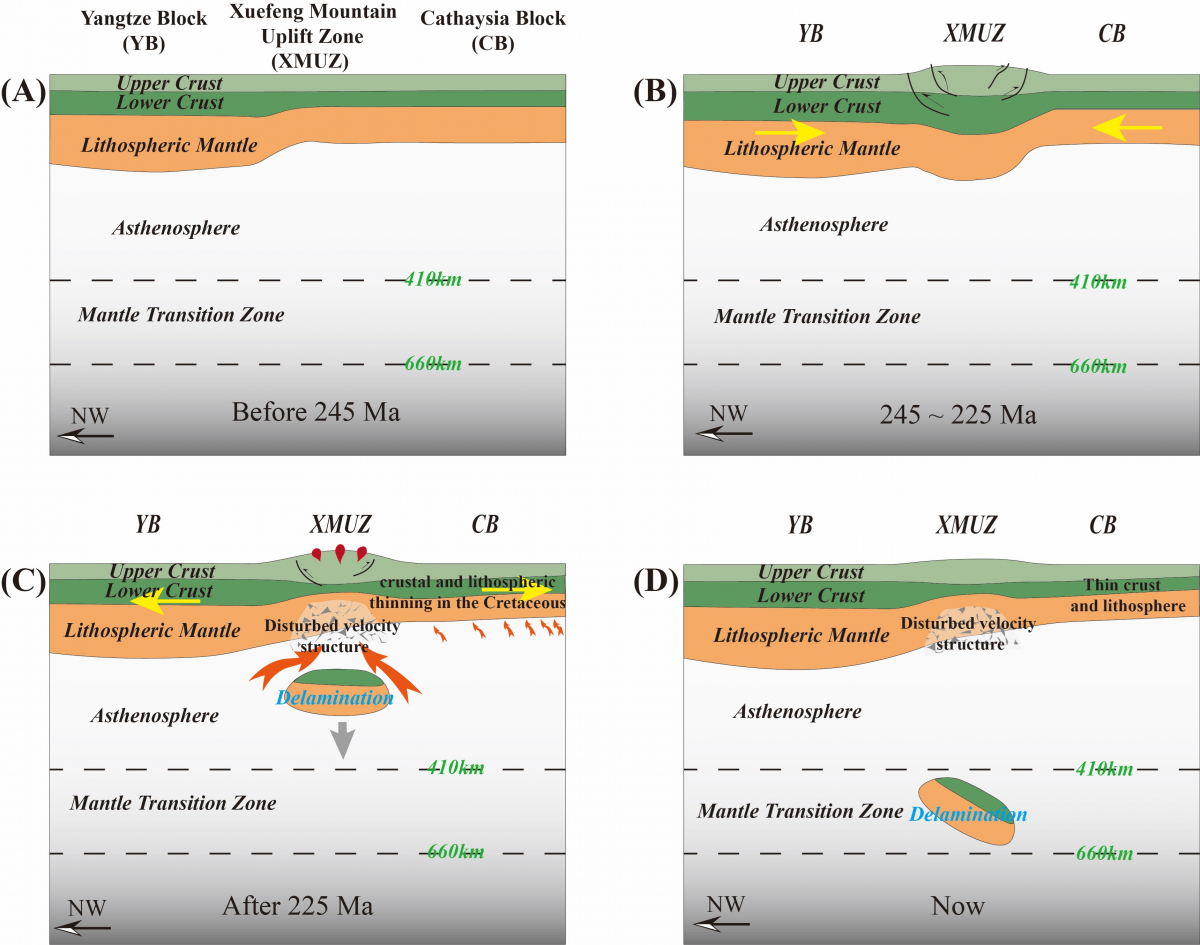 结合前人的层析成像结果与地质资料,作者推测雪峰山隆起带下方可能发生过岩石圈的拆沉,拆沉的岩石圈穿过上地幔并滞留在地幔过渡带中。6为其构造演化模式。