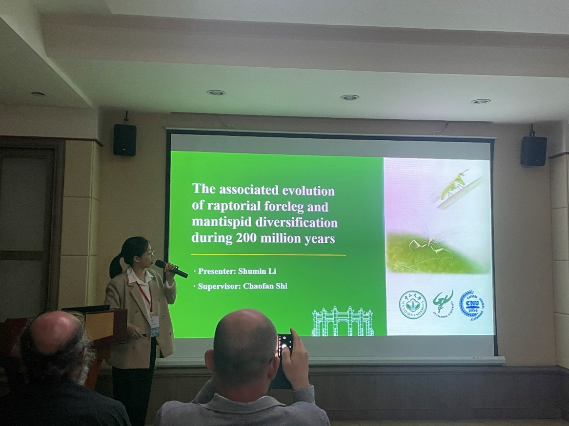 我院2023级硕士研究生李舒敏参加了此次大会,作了题为“The associated evolution of raptorial foreleg and mantispid diversification during 200 million years”的口头报告,获得了本届会议唯一的“最佳口头报告奖(Award of the Best Oral Presentation)”。报告内容讲述了综合跨学科研究方法所揭示的螳蛉捕捉足形态变异、功能演变历史及其在地史时期与螳蛉支系多样化的协同演化关系。内容丰富,获得了与会代表的好评与热烈讨论。