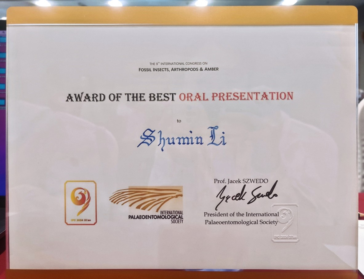 地科新闻 | 我院硕士生李舒敏在第九届国际古昆虫、节肢动物和琥珀大会中获最佳口头报告奖