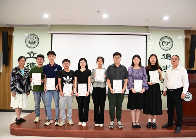 图:周丹媛女士、王岳军院长为获得杨遵仪院士特别奖学金的获奖者颁奖