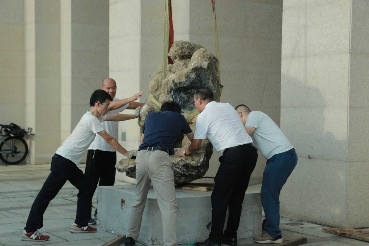 当天下午,在谢佑才校友、院领导、师生代表和吊装师傅的共同努力下,两块巨型方解石标本立于贵州钙质结核标本旁,陈列于海琴4号大楼前。海琴4号大楼西侧的门楼前,陈列着两块巨型钙质结核标本、两块巨型方解石标本,既丰富了学院地质矿物博物馆的馆藏,呈现出恢弘壮阔的气象,又与地球科学的学科专业特色相得益彰,实为校友和社会贤达在地科百年之际献上的一份“厚礼”!