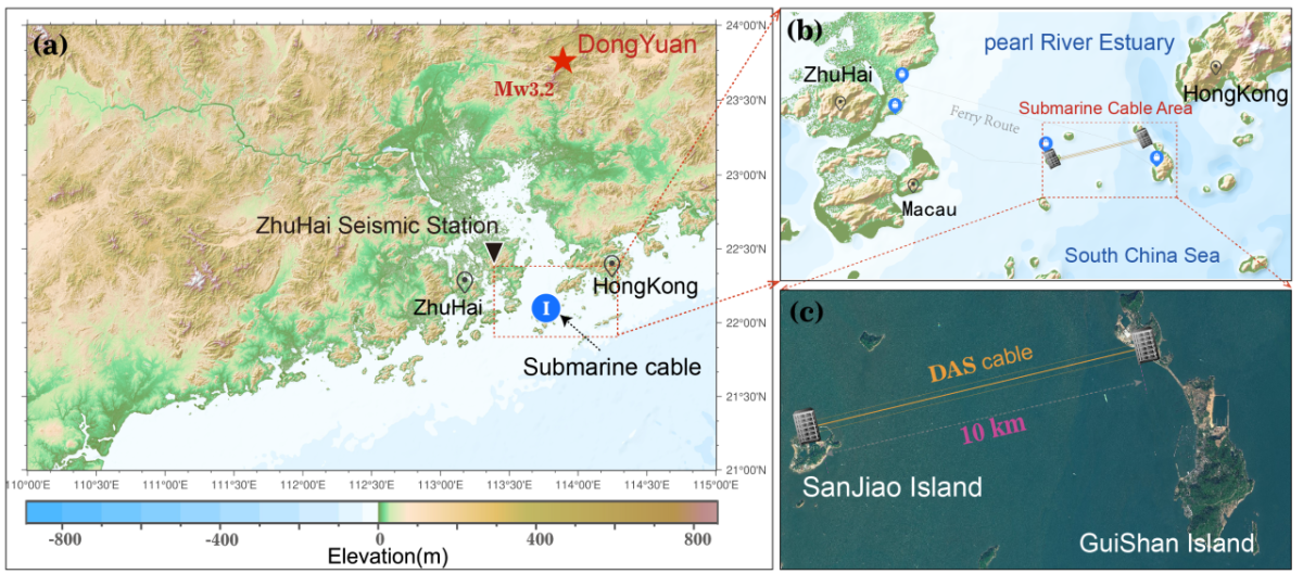 我院沈旭章教授团队与电子与信息工程学院李朝晖教授团队合作对近岸海底通信光缆小震响应特征进行了研究,研究成果近日以我院硕士研究生李豪为第一作者发表于Nature旗下期刊《Scientific Reports》(Q2,影响因子3.8)。本文在南海北部珠江口海域,如图一所示,通过分布式声波传感(DAS)技术,成功将一段10公里长的商用海底通信光缆改造为约5000个高灵敏度观测点组成的地震动监测阵列,进行地震动连续观测,其记录资料为研究周边地震、高分辨率地下结构及海底异常噪声提供了丰富资料。