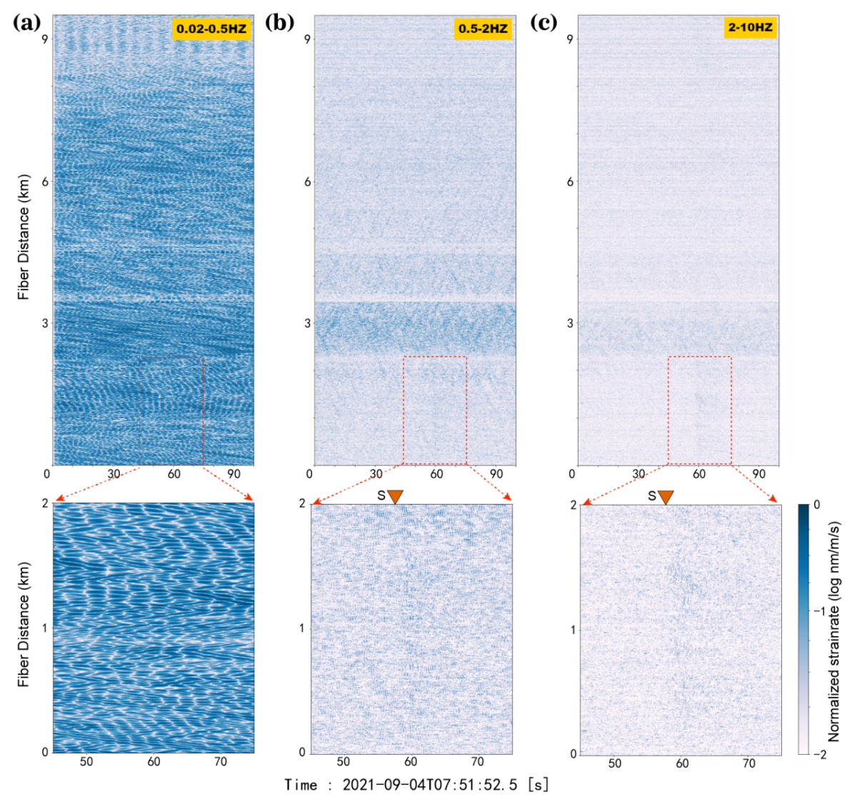 在浅海环境中,强烈的表面重力波(0.03-0.5Hz)和固液耦合产生的Scholte波(0.3-2Hz)给地震信号监测带来巨大挑战。研究团队通过对10次局部地震事件的观测数据分析,发现原始DAS信号中信噪比普遍低于0.5,地震波形几乎完全被环境噪声掩盖。图二展示了典型地震事件的原始信号时频特征,可见低频噪声能量显著高于地震信号频段。