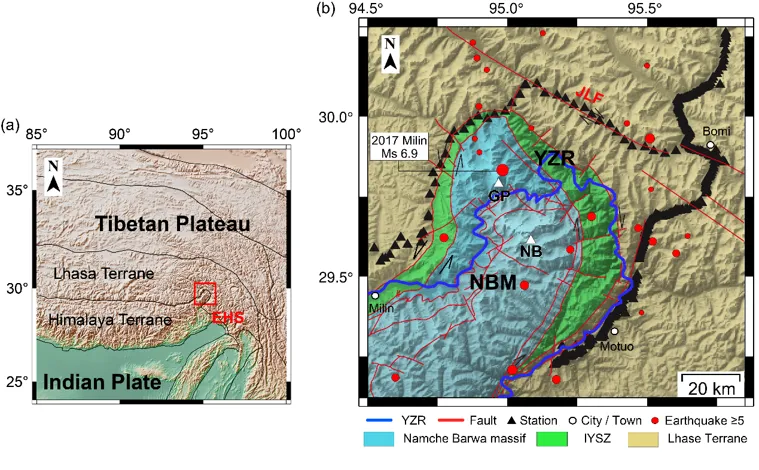 喜马拉雅东构造结又称南迦巴瓦构造结,是印度板块与欧亚板块碰撞的前缘地带。这里构造活动强烈、地震频发,被誉为“地质演化的天然实验室”。然而,受限于复杂地形与环境,此前对该区域浅层地壳结构的认识仍较模糊。