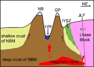 图4 南迦巴瓦地区地壳构造和岩浆作用示意图