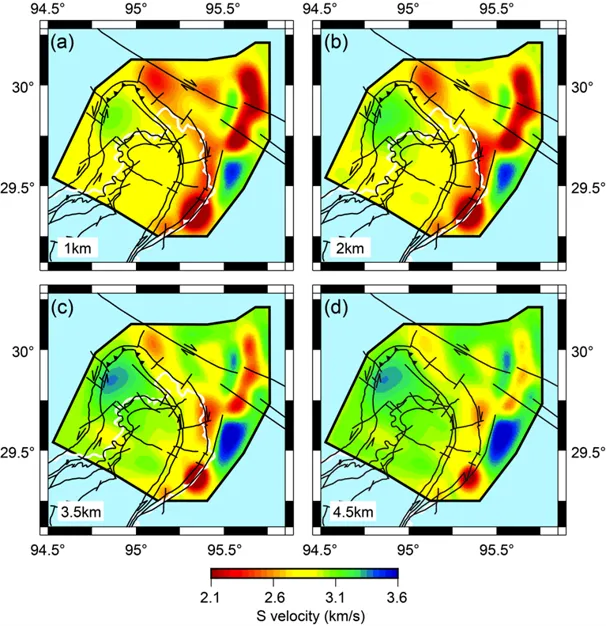基于短周期密集地震台阵的背景噪声面波层析成像,对南迦巴瓦地区周边的浅层地壳结构进行了高分辨率的成像(图2),主要结果如下: