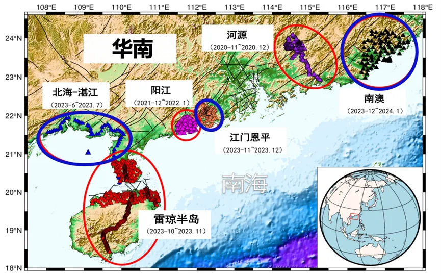 在此之前,李伦老师课题组已在广东河源、阳江、江门、汕头等地及海南省开展了短周期地震密集台阵观测(图3,图4),系统获取了中强震震源区与地震活跃区的地壳结构与物理属性。这些工作为深入理解粤琼地区板内历史中强地震的孕震构造背景与发震机制奠定了坚实基础。研究初步指出,流体活动与断层交汇处的应力积累是控制该区域中强地震发生的关键因素(详见Dong et al., 2022;Li et al., 2024;李伦等,2024;Yang et al., 2025)。此次围绕清远4.3级地震所部署的地震学观测,有望进一步丰富粤琼地区地震孕育与触发机制的认识。