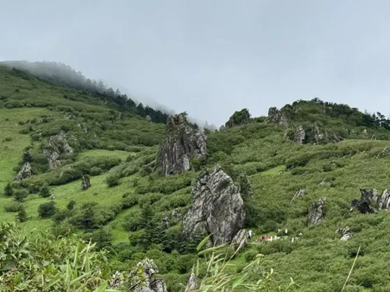 顶着大雾,师生们沿着蜿蜒山路前行,饱览山间景致,绿野间错落矗立的岩峰,瞬间成为目光焦点。同学们望着这些或孤峭、或相依,在云雾与草色映衬下更显奇特的峰林。