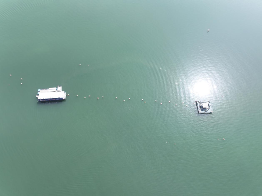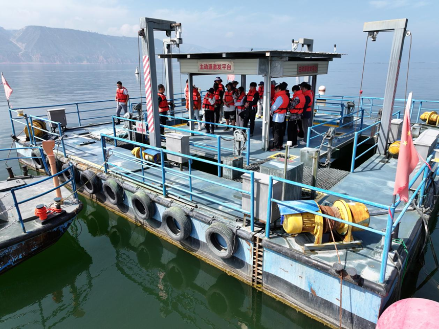 随后,同学们登上快艇,前往位于水库中的激发平台。湿润的风掠过面庞,小艇在平静的水面上荡开一道道涟漪,很快就登上了平台。工程师在控制平台上发出了信号,不一会儿,传来一阵猛烈的震动,让同学们在“震中”亲身经历了一次相当于里氏0.7级的地震。震动过后,气泡浮上水面,渐渐消散,而大家却还在回味地震带来的震撼。