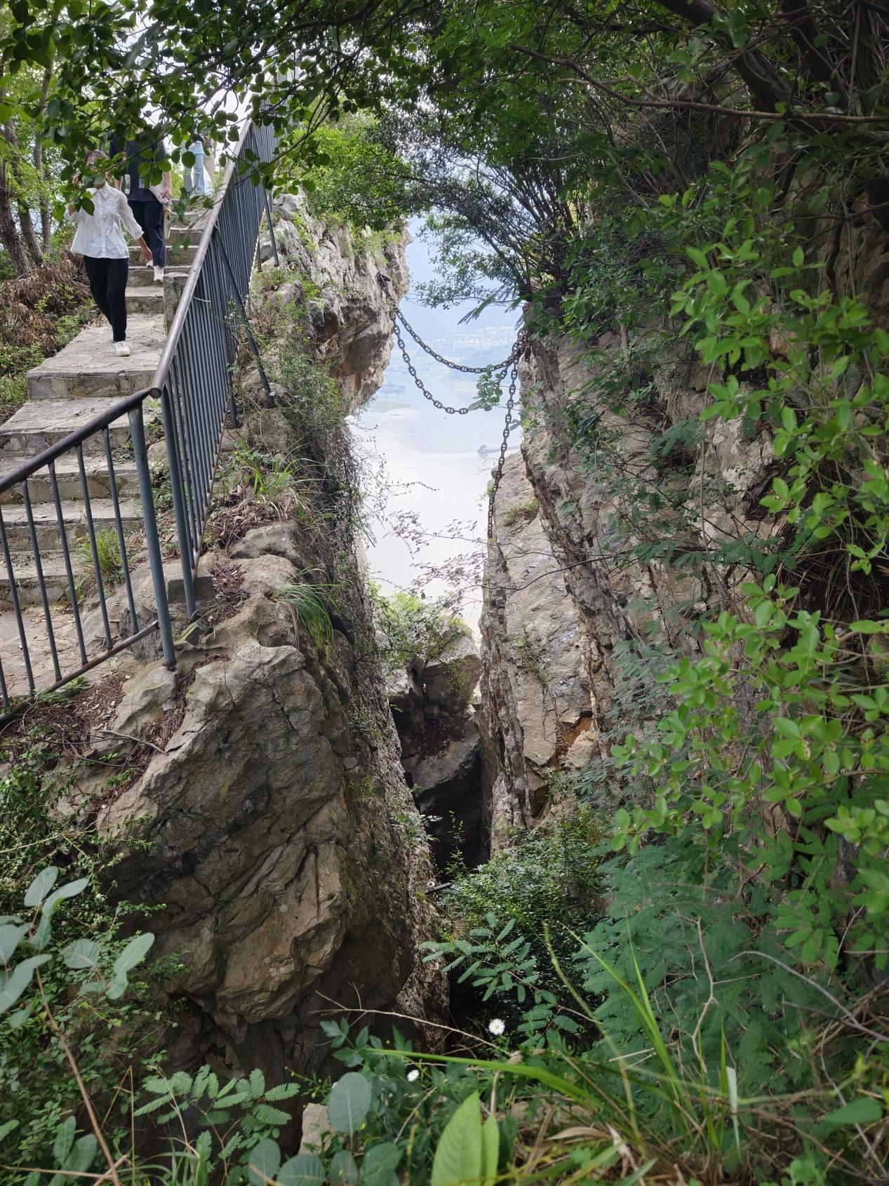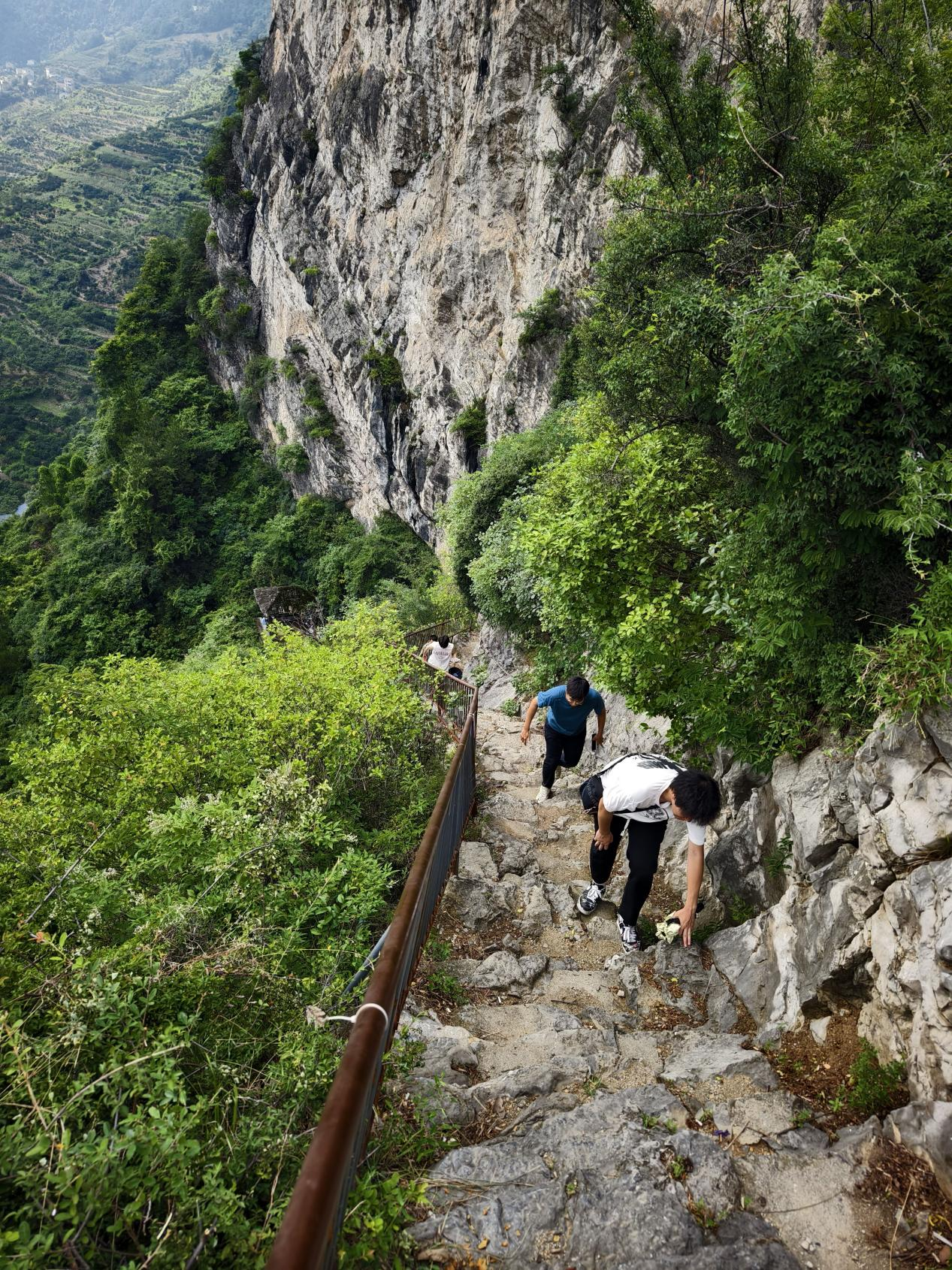 在观察完新滩滑坡之后,老师们带领同学们开始往山顶攀登。山风裹挟着草木清香扑面而来,往高处走,一侧是崖壁,一侧是悬崖。灰白色的石块层层叠叠,像大自然摊开的 “地质史册”。石阶或缓或陡,攀爬的汗水浸透衣衫,却浇不灭探索的热情。