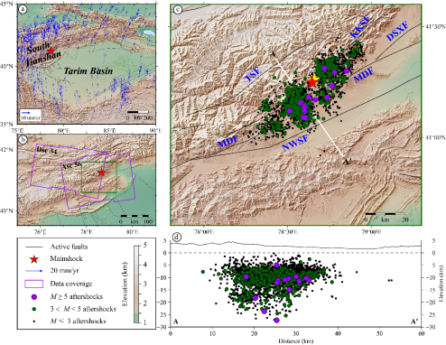 2024年1月23日,中国新疆阿克苏地区乌什县发生Mw7.0地震,该地震发生在南天山褶皱冲断带的迈丹断层上(图1),是印度—欧亚板块持续汇聚背景下的一次重要构造事件。准确揭示该地震的同震及震后滑动分布,对于评估区域地震危险性至关重要。以往研究多聚焦于乌什Mw7.0地震的同震滑动分析,但对震后形变演化及摩擦参数的约束仍存在明显不足。