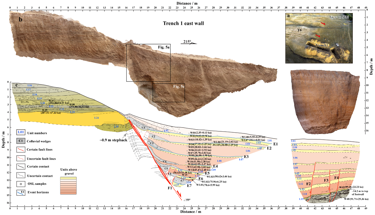 研究团队通过高分辨率激光雷达(LiDAR)获取的地貌分析和解译,识别出断裂垂直断错了多级河流阶地,根据地貌特征在色尔腾山东段布设了两个大型探槽,系统揭露了断裂带附近的沉积与构造特征。通过现场和高精度探槽信息扫描和解译,识别出至少存在7个坎前堆积(崩积楔)和24个较为为连续的沉积单元,在此基础上通过对沉积单元内采集的20个样品进行光释光测年,并结合OxCal贝叶斯模型分析,重建了该断裂段过去约9万年的大地震序列。研究结果显示,该段落在过去5万年内共发生了5次明确的地表破裂型大地震事件,其发生时间分别为7.0±1.1 ka、25.0±2.2 ka、35.6±1.5 ka、41.3±1.9 ka和46.2±2.4 ka。