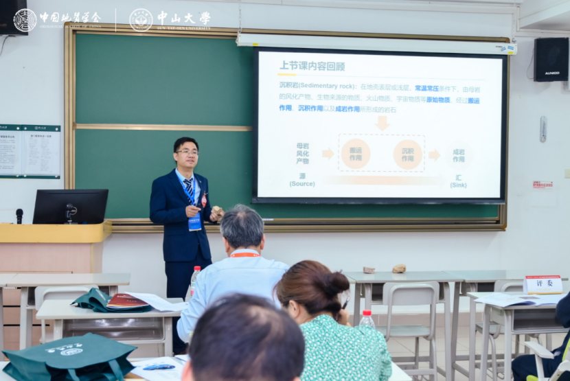 甘成势副教授参赛课程为《岩石学》,讲授了沉积岩总论部分“沉积物的搬运和沉积作用”节段,以中华民族的母亲河——黄河为导入,介绍了碎屑物质在不同地质营力(流水、风、冰川和重力)中的机械搬运与沉积作用。他以生活中常见的自然现象出发,注重引导学生总结规律并发现问题,以理论教学和案例分析相结合,引导学生以非常规思维思考地质问题,注重培养学生的批判性思维与自主探究能力。