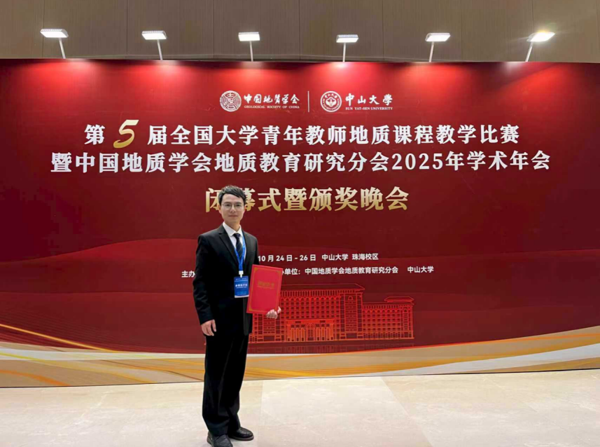 钱老师始终将教书育人视为课堂的核心,平日他细心观察学生反应,默默沉淀教学心得。课后他常主动询问同学们:“刚才的内容听起来怎么样?有没有哪里觉得不清楚?”并记录下同学们提到的建议。在备战2025年全国大学青年教师地质课程教学比赛期间,他系统梳理日常积累,将专业知识点与育人目标深度结合,呈现了一节精炼而富有启发的20分钟课堂。赛后,他并未止步于荣誉,而是努力将比赛中的启发与方法带回日常教学当中。正是这份贯穿于平时、赛时与赛后的持续用心,让他在比赛中荣获特等奖,实现了“以赛促教、以教育人”的朴实回归。