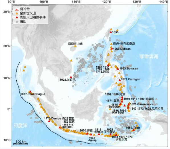 图 3 南海及其周缘区域历史火山海啸事件和潜在火山海啸源