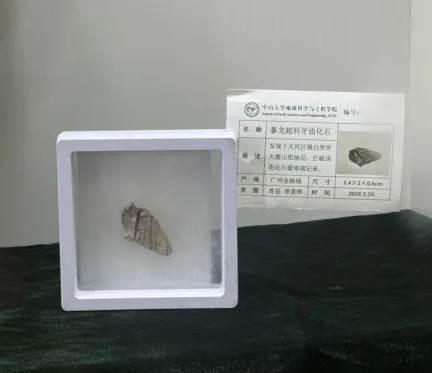 我院校友曾强一直怀念在母校学习的美好时光,用给学院捐赠化石的方式表达对学院及老师的感谢,祝福学院越办越好!除了这枚暴龙牙齿化石外,曾强校友还捐赠了包括古鱼、螃蟹等古生物化石给我院地质矿物博物馆。校友的慷慨捐赠,让这些古生物化石得以在博物馆中发挥多重价值,在科普层面,它向公众生动展现了华南深埋的古生物史诗;在精神层面,它更传承着中大地科人一脉相承的“奉献”基因——将个人珍藏融入学科传承,让科学发现成为公共记忆!