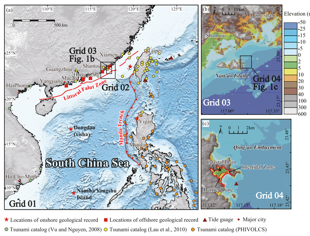 图1南海区域及模型嵌套网格计算域。(a)南海历史海啸记录、疑似海啸沉积及潜在海啸源分布;(b)南澳岛及周边主要城市位置;(c)青澳湾裸地高程图