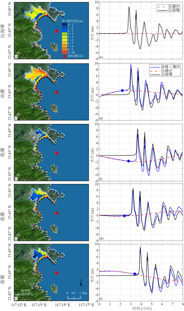 图2不同典型潮相条件下青澳湾海啸—潮汐耦合模拟的淹没深度分布及虚拟潮位站点水位变化。